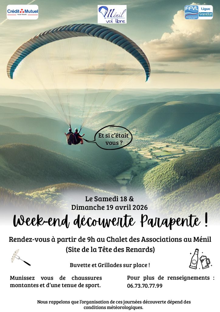 Rejoignez-nous pour un week-end découverte parapente les samedi 18 et dimanche 19 avril 2026 ! 📍 Rendez-vous dès 9h au Chalet des Associations au Ménil (Site de la Tête des Renards) 🔥 Sur place : buvette & grillades pour un moment convivial 👟 À prévoir : chaussures montantes et tenue de sport ⚠️ L’événement est soumis aux conditions météorologiques 📞 Infos & réservations : 06.73.70.77.99 Prêt(e) à tenter l’aventure ? ✈️