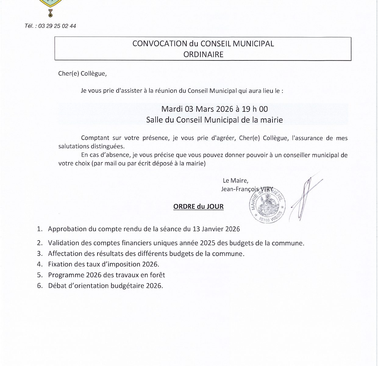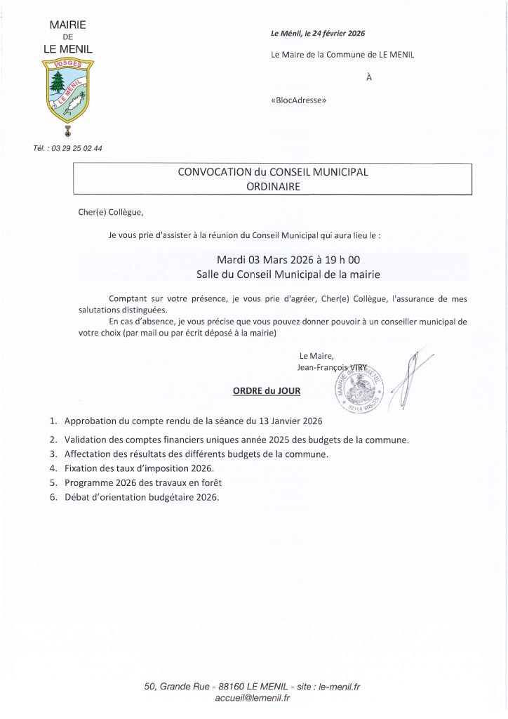 Mardi 03 mars 2026 à 19h00 en Salle du Conseil Municipal de la Mairie de Le Ménil.